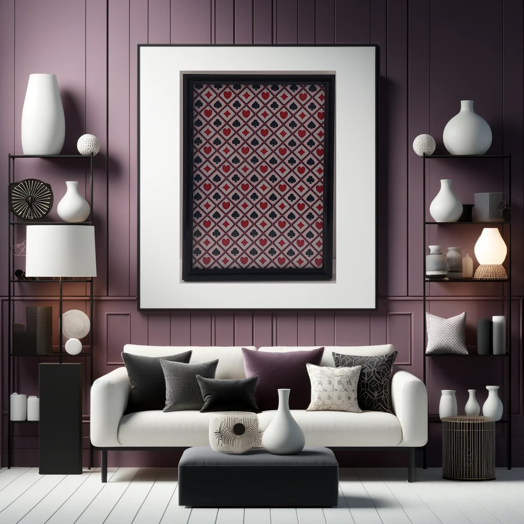 Create an elegant and stylish atmosphere with our striking artwork featuring a pattern design of French playing card suits arranged in a grid. Each suit unfolds in an orderly manner, creating a piece that balances sophistication with a playful touch. This artwork is perfect for card game enthusiasts and adds a visual charm to any space. Let your decor speak of elegance and fun with this unique work of art.