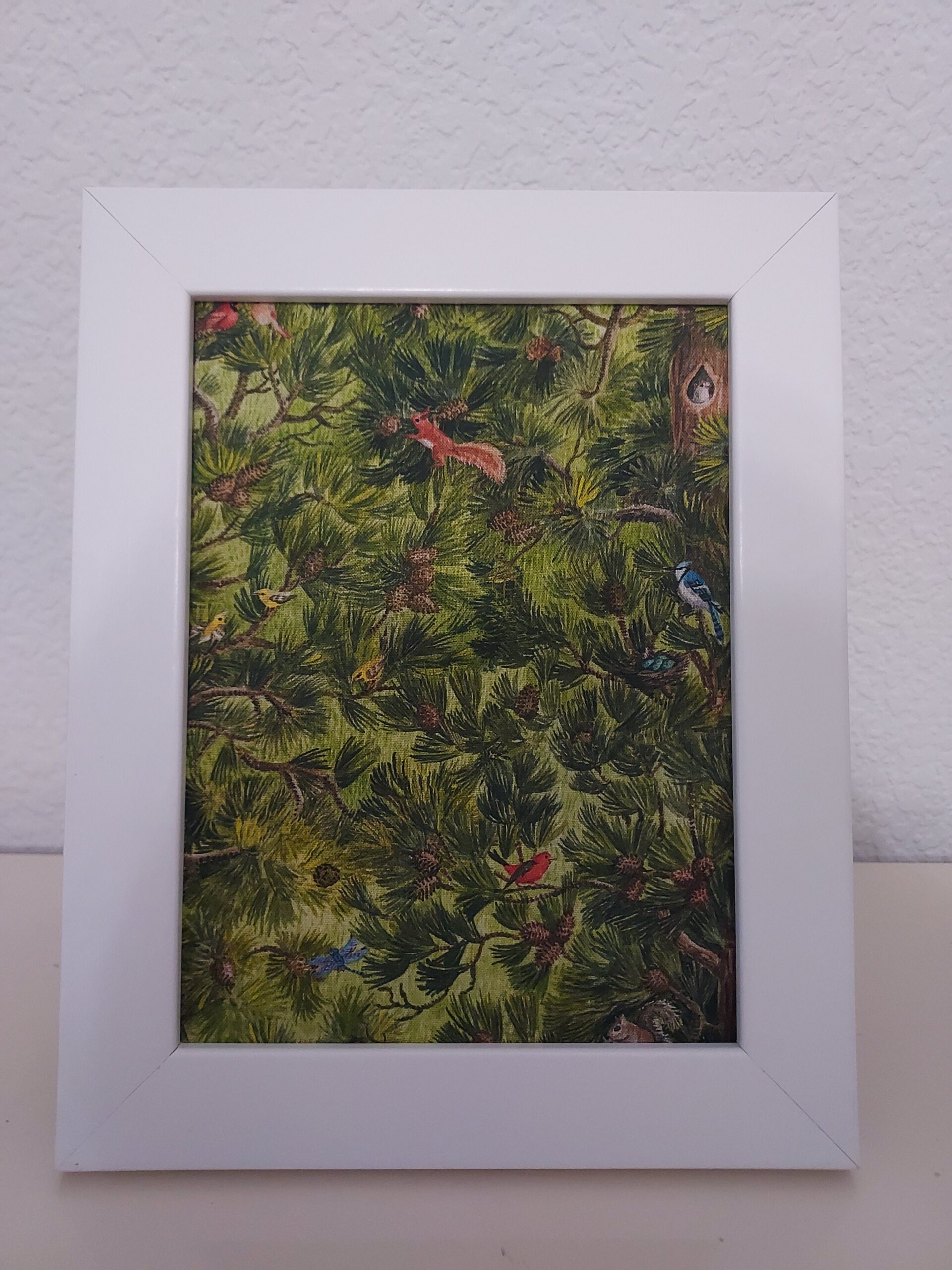 El producto incluye el tejido de algodón enmarcado en PVC blanco con cristal de vidrio de 13×18 cm.
